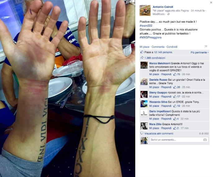 Dopo la caduta durante le qualifiche a Maggiora, che avevano fatto temere il peggio, Tony Cairoli ha stretto i denti e ha partecipato alla gara chiudendo con un grandioso settimo posto Gara 1. Il pilota siciliano, che ha scongiurato la rottura del polso, ha postato le foto del braccio sinistro sui profili Facebook e Instagram