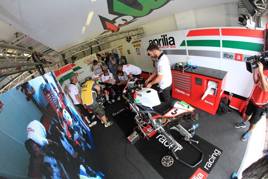 Sono 18 i giri che Max Biaggi ha compiuto in sella alla bellissima Aprilia RSV4 RF per l’occasione vestita di un nuovo abito tricolore. Biaggi domina praticamente tutto il turno, ma soprattutto nell’ultima fase del turno abbatte il muro del 1’36.000 portando la sua RSV sul crono di tutto rispetto di 1’35.684, relegando Chaz Davies, con la Ducati Panigale R, al secondo posto con un distacco pesante di quasi mezzo secondo (1’36.156). Terzo posto per Jonathan Rea (1’36.201). Max Biaggi è ovviamente parso subito a proprio agio sulla Aprilia e praticamente non ha commesso errori o sbavature.