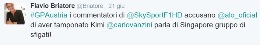 Durante l'ultimo GP di Formula 1 in Austria, a pochi giri dal via Kimi Raikkonen e Fernando Alonso sono stati protagonisti di un incidente che ha messo fuori dai giochi entrambe. Inizialmente non si è capita la dinamica precisa e quindi chi avesse la colpa dell'impatto. Dopo una ricostruzione però sembra che il finlandese della ferrari abbia perso il controllo e Alonso l'abbia tamponato per questo motivo. Da qciò il "fastidio" di Flavio Briatore tutto descritto nei suoi tweet.