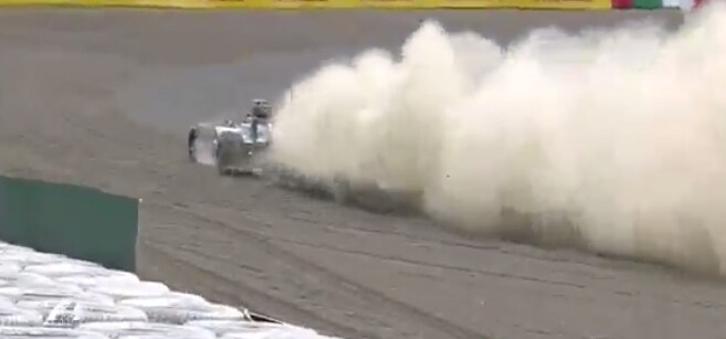 Ricciardo e Massa si toccano nella prima curva e rovinano le gomme. Entrambe vanno ai box. Finisce lungo fuoripista ache Perez.