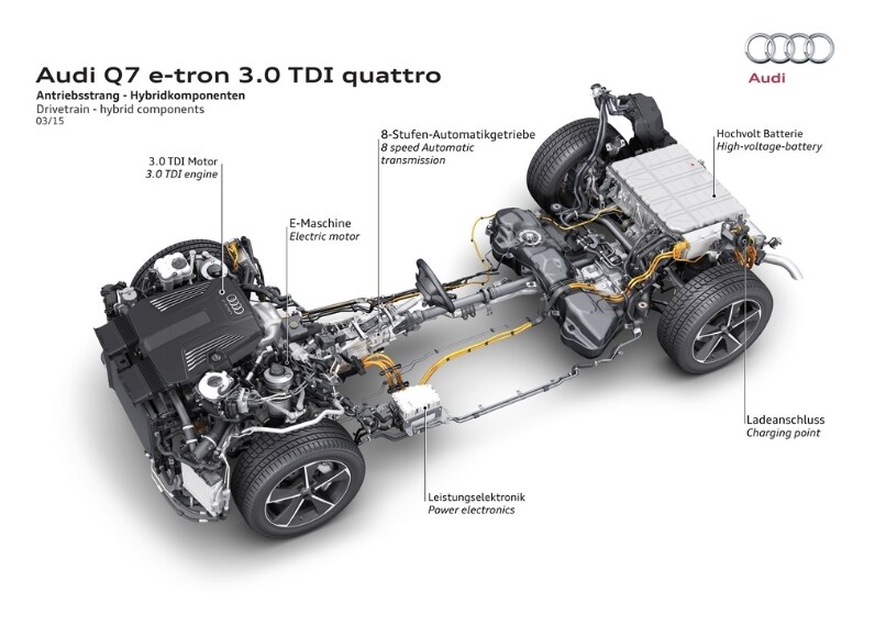 Il grosso SUV tedesco passa all'ibrido. La nuova Audi Q7 abbina l'efficiente propulsore V6 TDI 3.0 litri ad un'unità elettrica integrata nel cambio tiptronic.