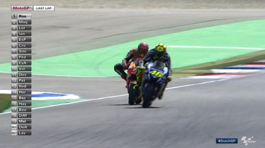 Il “Dottore” vince il Motul TT Assen dopo un’accesa battaglia con Marc Marquez fino all'ultima chicane. Lo spagnolo della Honda tenta il tutto e per tutto all'ultimo giro,e si infila all'interno della traiettoria dell'ultima chicane toccando il pesarese. Rossi salta il cordolo e incredibilmente taglia la curva sulla ghiaia, andando a tagliare per primo il traguardo del Gp d'Olanda.
