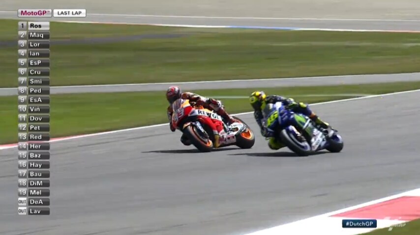 Il “Dottore” vince il Motul TT Assen dopo un’accesa battaglia con Marc Marquez fino all'ultima chicane. Lo spagnolo della Honda tenta il tutto e per tutto all'ultimo giro,e si infila all'interno della traiettoria dell'ultima chicane toccando il pesarese. Rossi salta il cordolo e incredibilmente taglia la curva sulla ghiaia, andando a tagliare per primo il traguardo del Gp d'Olanda.