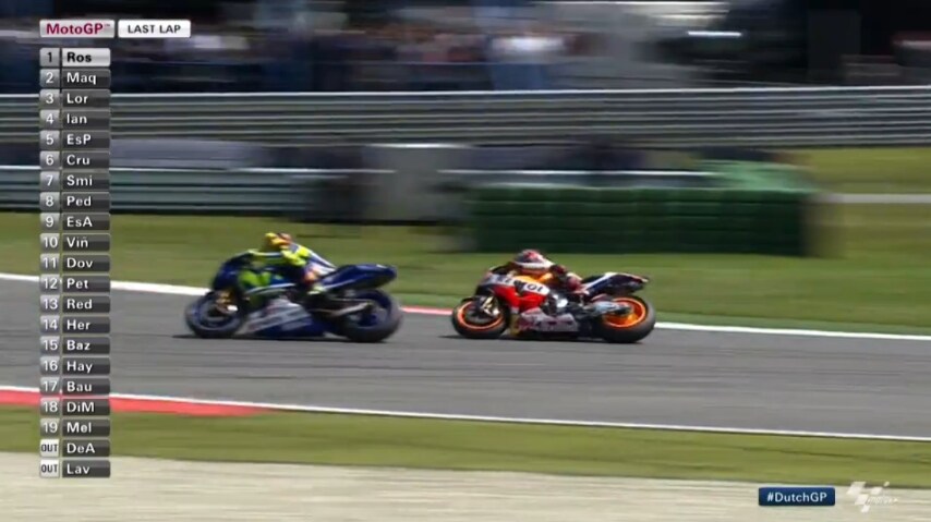 Il “Dottore” vince il Motul TT Assen dopo un’accesa battaglia con Marc Marquez fino all'ultima chicane. Lo spagnolo della Honda tenta il tutto e per tutto all'ultimo giro,e si infila all'interno della traiettoria dell'ultima chicane toccando il pesarese. Rossi salta il cordolo e incredibilmente taglia la curva sulla ghiaia, andando a tagliare per primo il traguardo del Gp d'Olanda.