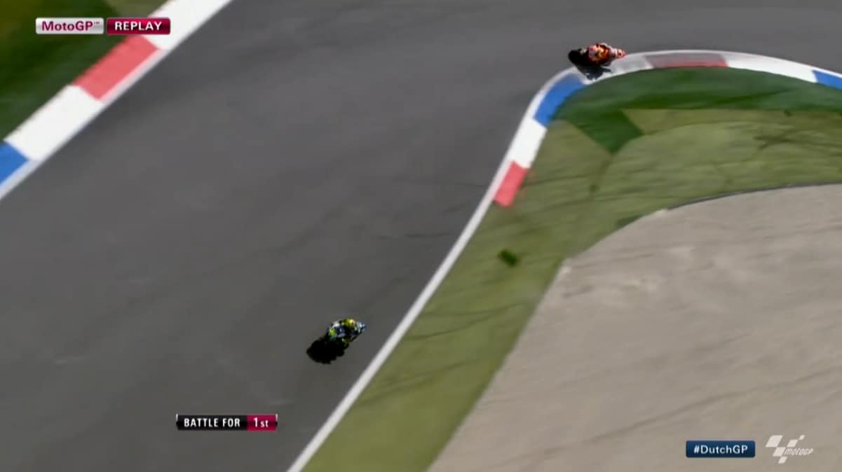Il “Dottore” vince il Motul TT Assen dopo un’accesa battaglia con Marc Marquez fino all'ultima chicane. Lo spagnolo della Honda tenta il tutto e per tutto all'ultimo giro,e si infila all'interno della traiettoria dell'ultima chicane toccando il pesarese. Rossi salta il cordolo e incredibilmente taglia la curva sulla ghiaia, andando a tagliare per primo il traguardo del Gp d'Olanda.