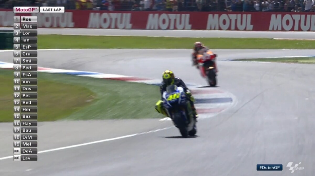 Il “Dottore” vince il Motul TT Assen dopo un’accesa battaglia con Marc Marquez fino all'ultima chicane. Lo spagnolo della Honda tenta il tutto e per tutto all'ultimo giro,e si infila all'interno della traiettoria dell'ultima chicane toccando il pesarese. Rossi salta il cordolo e incredibilmente taglia la curva sulla ghiaia, andando a tagliare per primo il traguardo del Gp d'Olanda.