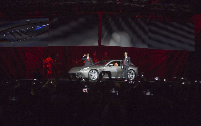 I due piloti della Ferrari hanno portato sul palco di Villa Erba la nuova Ferrari GTC4Lusso 12, la nuova cilindri 4 posti e 4 ruote motrici sterzanti , l'ultima nata del Cavallino presentata in un evento privato prima del debutto al prossimo Salone di Ginevra.