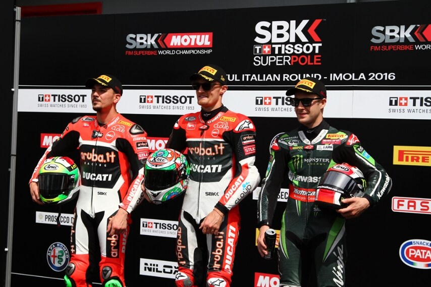 Sulle curve dell'Autodromo Internazionale Enzo e Dino Ferrari di Imola è festa Ducati anche in Superpole. Chaz Davies conquista la prima casella in griglia, dopo aver dominato tutte e tre le sessioni di prove libere. Alle spalle del gallese, che ha firmato il best lap in 1'45.598, l'altra Panigale ufficiale di Davide Giugliano (+0.457) e la Kawasaki di Jonathan Rea (+0.730).