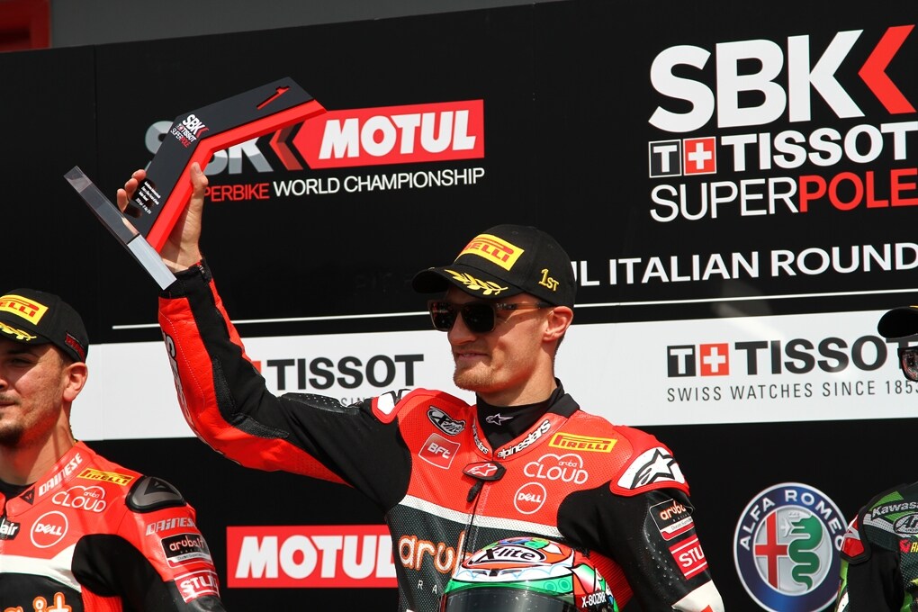 Sulle curve dell'Autodromo Internazionale Enzo e Dino Ferrari di Imola è festa Ducati anche in Superpole. Chaz Davies conquista la prima casella in griglia, dopo aver dominato tutte e tre le sessioni di prove libere. Alle spalle del gallese, che ha firmato il best lap in 1'45.598, l'altra Panigale ufficiale di Davide Giugliano (+0.457) e la Kawasaki di Jonathan Rea (+0.730).