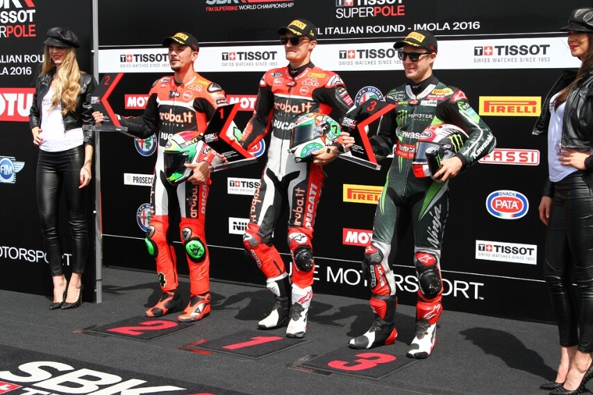 Sulle curve dell'Autodromo Internazionale Enzo e Dino Ferrari di Imola è festa Ducati anche in Superpole. Chaz Davies conquista la prima casella in griglia, dopo aver dominato tutte e tre le sessioni di prove libere. Alle spalle del gallese, che ha firmato il best lap in 1'45.598, l'altra Panigale ufficiale di Davide Giugliano (+0.457) e la Kawasaki di Jonathan Rea (+0.730).