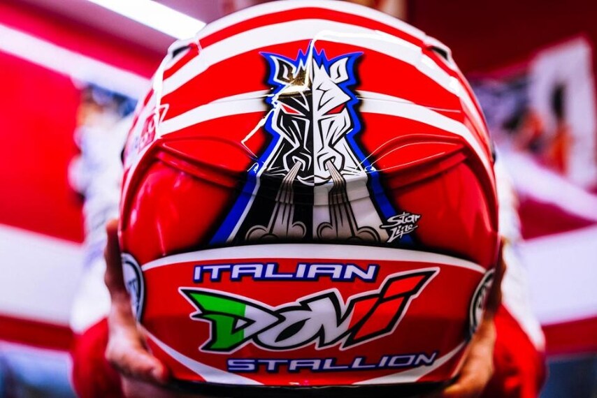 Non solo Valentino Rossi a sfoggiare una nuova grafica sul casco per il Gp d'Italia. Anche i due alfieri Ducati, Andrea Iannone e Andrea Dovizioso indossano un casco speciale al Mugello. Su quello dell'abruzzese, con le grafiche realizzate in collaborazione on il designer Aldo Drudi, sono presenti le molecole di adrenalina, l’ormone che scorre nelle vene del pilota in pista e il logo Agv, ripetuto anche nella parte superiore della visiera insieme al logo Ducati. La mentoniera, ha il tratto distintivo di Iannone: il numero 29 su fondo bianco unito al logo della casa di Borgo Panigale. Per Dovizioso invece, il tema è "Italian Dovi Stallion" ispirato al primo film di “Rocky Balboa". La grafica è impreziosita sul retro da due cavalli, ragione e follia, dal 2014 simbolo di Andrea, ripresi in un'unica testa che richiama lo stallone italiano. Completano la grafica le linee blu presenti anche sulla tuta tuta, altre rosse come la sua Desmosedici e il logo Suomy.