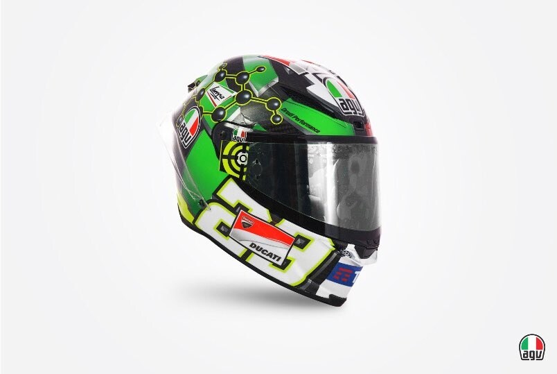 Non solo Valentino Rossi a sfoggiare una nuova grafica sul casco per il Gp d'Italia. Anche i due alfieri Ducati, Andrea Iannone e Andrea Dovizioso indossano un casco speciale al Mugello. Su quello dell'abruzzese, con le grafiche realizzate in collaborazione on il designer Aldo Drudi, sono presenti le molecole di adrenalina, l’ormone che scorre nelle vene del pilota in pista e il logo Agv, ripetuto anche nella parte superiore della visiera insieme al logo Ducati. La mentoniera, ha il tratto distintivo di Iannone: il numero 29 su fondo bianco unito al logo della casa di Borgo Panigale. Per Dovizioso invece, il tema è "Italian Dovi Stallion" ispirato al primo film di “Rocky Balboa". La grafica è impreziosita sul retro da due cavalli, ragione e follia, dal 2014 simbolo di Andrea, ripresi in un'unica testa che richiama lo stallone italiano. Completano la grafica le linee blu presenti anche sulla tuta tuta, altre rosse come la sua Desmosedici e il logo Suomy.