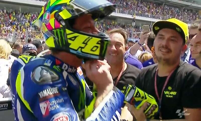 Pace fatta? Valentino Rossi e Marc Marquez si stringono la mano al termine del Gp di Barcellona. Evento eccezionale considerate le polemiche del finale della scorsa stagione in seguito al contatto nel Gp della Malesia a Sepang.