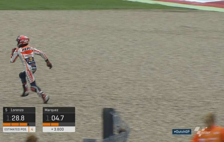 Lo spagnolo perde il controllo della sua Honda nel giro di lancio e finisce lungo la via di fuga. Con grande reattività si rialza, prende uno scooter a un fotografo italiano (Tino Martino) e transitando per il paddock torna al box per poi rientrare in pista con la seconda moto e trovare un insperato quarto tempo che gli permette di scattare dalla seconda fila del GP d'Olanda.