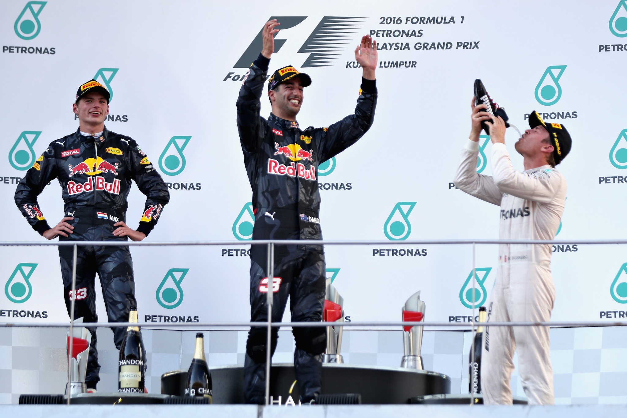 L'australiano sale sul gradino più alto dal podio e festeggia nel tradizionale modo australiano, ossia con la shoey. Non contento il pilota della Red Bull offre ai compagni di podio da bere, sempre rigorosamente dalla sua scarpa: Horner, Rosberg e Verstappen, dopo qualche riserva, accettano.