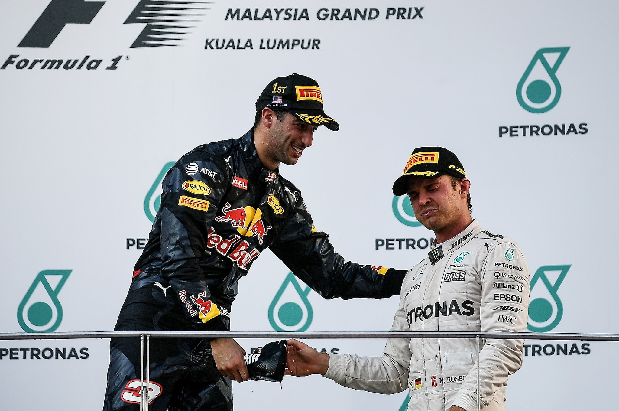 L'australiano sale sul gradino più alto dal podio e festeggia nel tradizionale modo australiano, ossia con la shoey. Non contento il pilota della Red Bull offre ai compagni di podio da bere, sempre rigorosamente dalla sua scarpa: Horner, Rosberg e Verstappen, dopo qualche riserva, accettano.