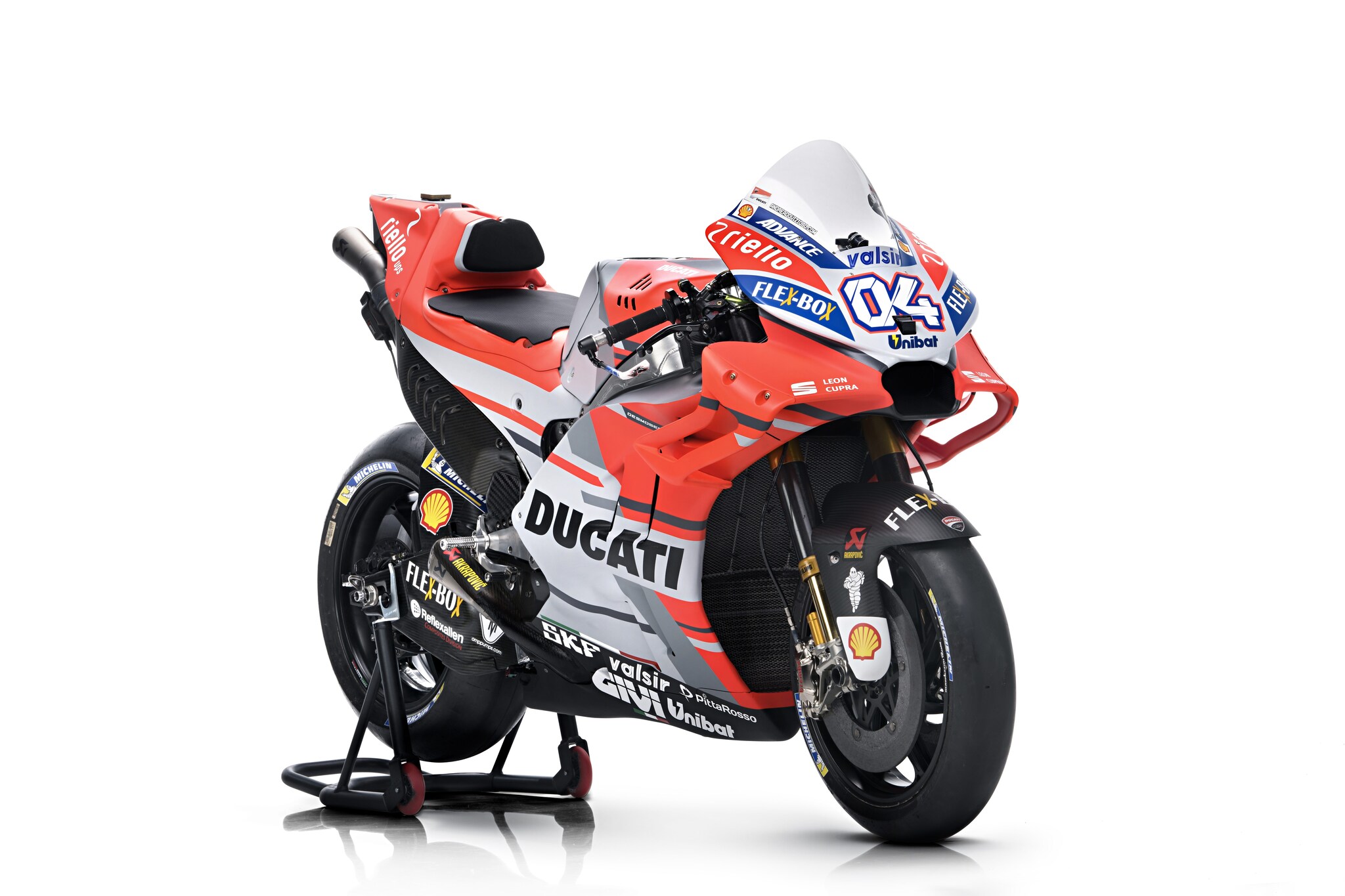 Nuovi colori per le Desmosedici con cui Andrea Dovizioso e Jorge Lorenzo affronteranno il mondiale MotoGP 2018. Oltre al Rosso Ducati e al bianco che hanno caratterizzato i colori delle ultime stagioni, la livrea guadagna anche anche fascia griglia che attraversa serbatoio e carene laterali. Rivisto anche il propulsore, con qualche cavallo in più, ma anche ciclistica e aerodinamica.