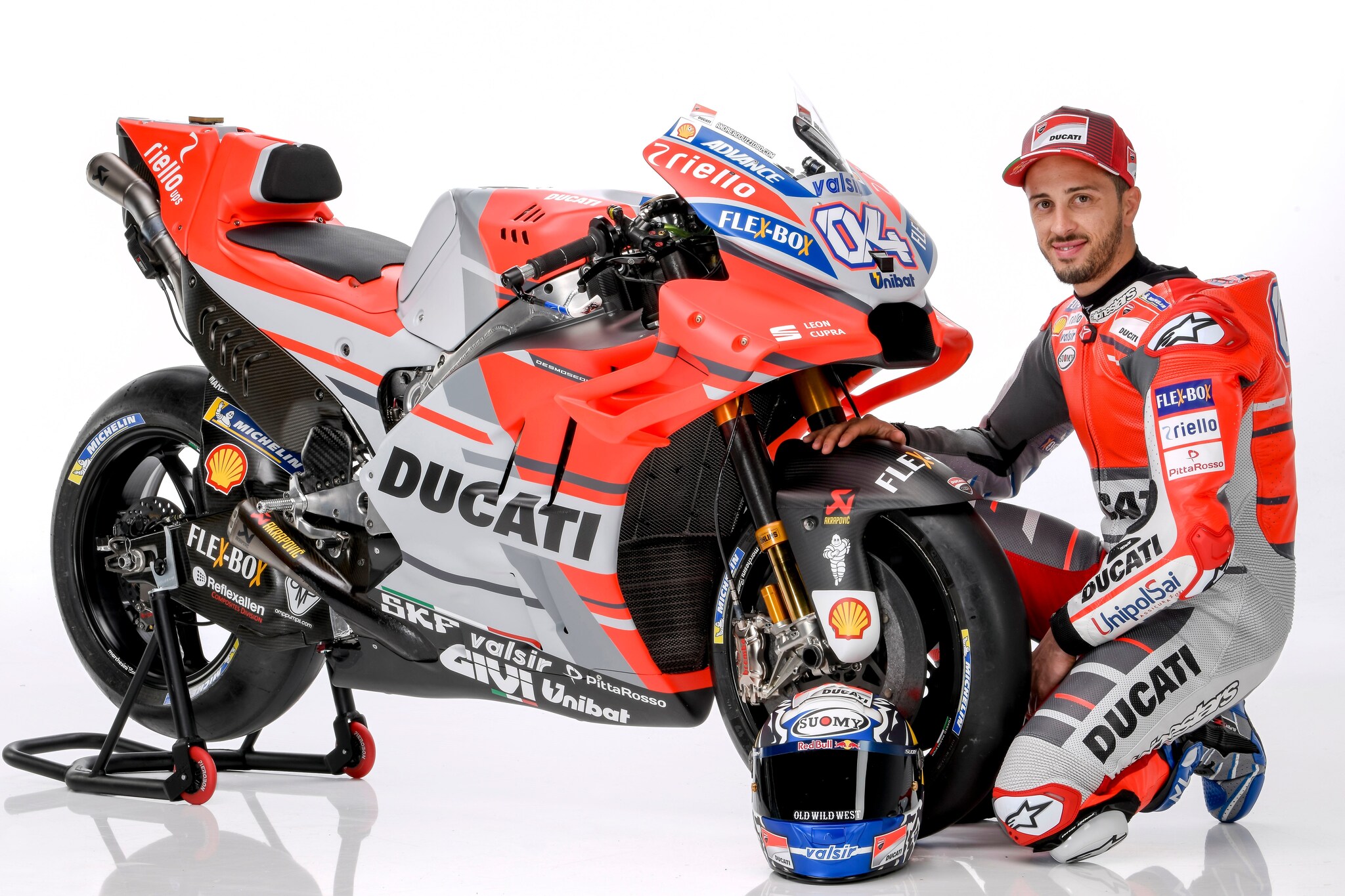 Nuovi colori per le Desmosedici con cui Andrea Dovizioso e Jorge Lorenzo affronteranno il mondiale MotoGP 2018. Oltre al Rosso Ducati e al bianco che hanno caratterizzato i colori delle ultime stagioni, la livrea guadagna anche anche fascia griglia che attraversa serbatoio e carene laterali. Rivisto anche il propulsore, con qualche cavallo in più, ma anche ciclistica e aerodinamica.