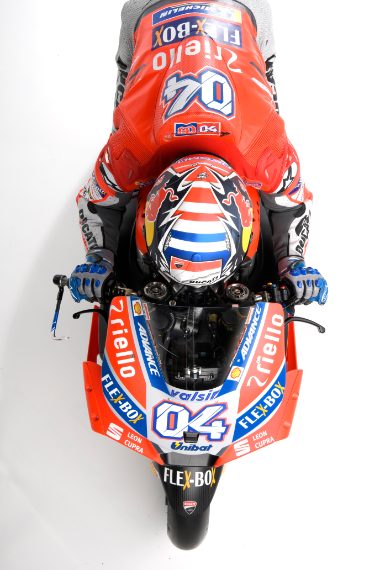 Nuovi colori per le Desmosedici con cui Andrea Dovizioso e Jorge Lorenzo affronteranno il mondiale MotoGP 2018. Oltre al Rosso Ducati e al bianco che hanno caratterizzato i colori delle ultime stagioni, la livrea guadagna anche anche fascia griglia che attraversa serbatoio e carene laterali. Rivisto anche il propulsore, con qualche cavallo in più, ma anche ciclistica e aerodinamica.