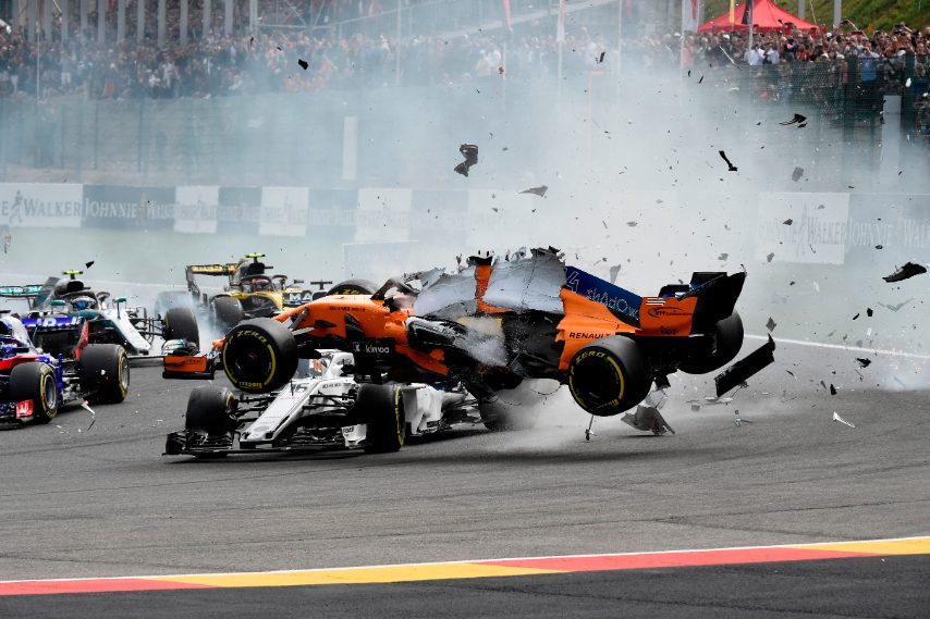 Un incidente tanto spettacolare quanto pericoloso quello capitato a Fernando Alonso: la McLaren dello spagnolo, infatti, alla prima curva del tracciato di Spa-Francorchamps, dopo essere stato tamponato dalla Renault di Nico Hulkenberg, ha letteralmente preso il volo carambolando sull'Alfa Romeo Sauber di Charles Leclerc. Solo l'Halo ha evitato conseguenze peggiori per il giovane pilota monegasco mentre inevitabili il ritiro sia per lui che per il due volte campione del mondo che ha riportato seri danni alla vettura che gli hanno impedito di riprendere la pista.