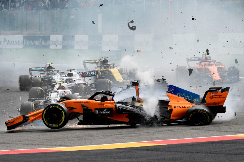 Un incidente tanto spettacolare quanto pericoloso quello capitato a Fernando Alonso: la McLaren dello spagnolo, infatti, alla prima curva del tracciato di Spa-Francorchamps, dopo essere stato tamponato dalla Renault di Nico Hulkenberg, ha letteralmente preso il volo carambolando sull'Alfa Romeo Sauber di Charles Leclerc. Solo l'Halo ha evitato conseguenze peggiori per il giovane pilota monegasco mentre inevitabili il ritiro sia per lui che per il due volte campione del mondo che ha riportato seri danni alla vettura che gli hanno impedito di riprendere la pista.