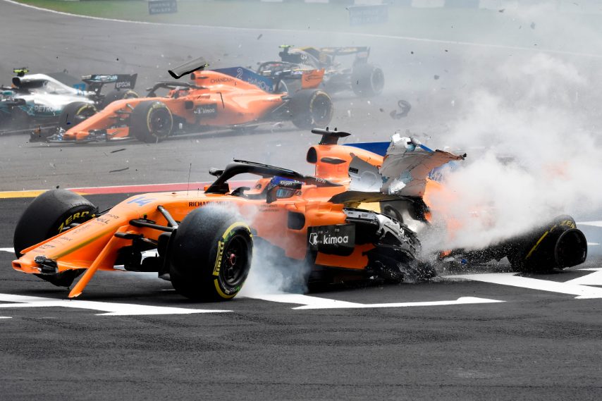 Un incidente tanto spettacolare quanto pericoloso quello capitato a Fernando Alonso: la McLaren dello spagnolo, infatti, alla prima curva del tracciato di Spa-Francorchamps, dopo essere stato tamponato dalla Renault di Nico Hulkenberg, ha letteralmente preso il volo carambolando sull'Alfa Romeo Sauber di Charles Leclerc. Solo l'Halo ha evitato conseguenze peggiori per il giovane pilota monegasco mentre inevitabili il ritiro sia per lui che per il due volte campione del mondo che ha riportato seri danni alla vettura che gli hanno impedito di riprendere la pista.