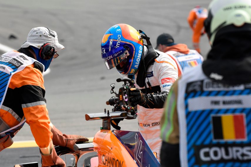 Un incidente tanto spettacolare quanto pericoloso quello capitato a Fernando Alonso: la McLaren dello spagnolo, infatti, alla prima curva del tracciato di Spa-Francorchamps, dopo essere stato tamponato dalla Renault di Nico Hulkenberg, ha letteralmente preso il volo carambolando sull'Alfa Romeo Sauber di Charles Leclerc. Solo l'Halo ha evitato conseguenze peggiori per il giovane pilota monegasco mentre inevitabili il ritiro sia per lui che per il due volte campione del mondo che ha riportato seri danni alla vettura che gli hanno impedito di riprendere la pista.