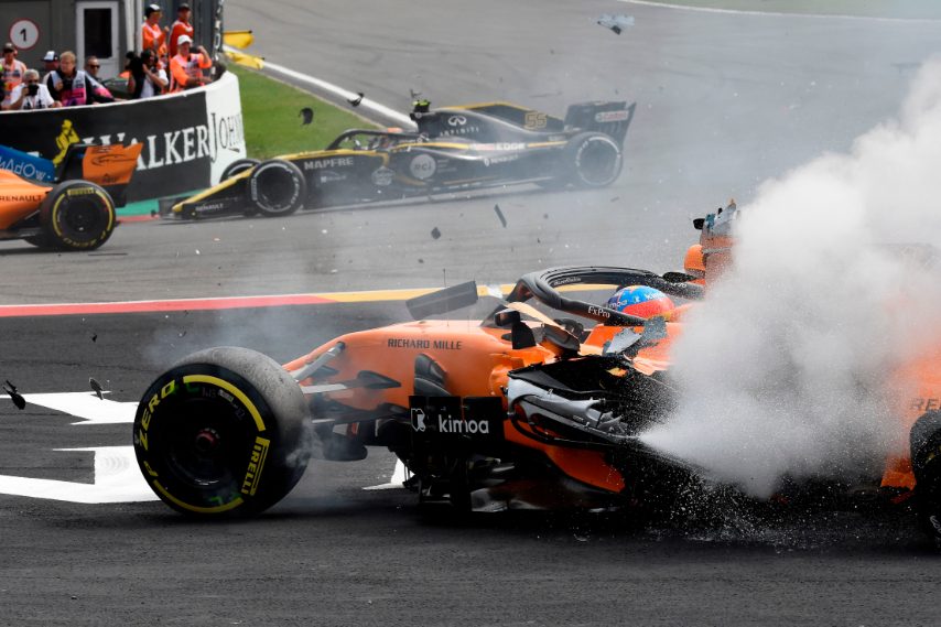 Un incidente tanto spettacolare quanto pericoloso quello capitato a Fernando Alonso: la McLaren dello spagnolo, infatti, alla prima curva del tracciato di Spa-Francorchamps, dopo essere stato tamponato dalla Renault di Nico Hulkenberg, ha letteralmente preso il volo carambolando sull'Alfa Romeo Sauber di Charles Leclerc. Solo l'Halo ha evitato conseguenze peggiori per il giovane pilota monegasco mentre inevitabili il ritiro sia per lui che per il due volte campione del mondo che ha riportato seri danni alla vettura che gli hanno impedito di riprendere la pista.