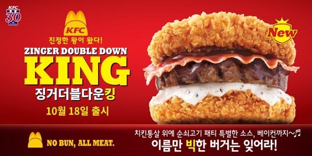 Si chiama Zinger Double Down King ed è il nuovo panino sul menù della catena di fast food Kentucky Fried Chicken (KFC). Come si vede dalla foto al posto del pane ci sono due spesse fette di pollo fritto. All’interno un tortino di manzo condito con pancetta, formaggio, salsa barbecue e maionese. Calorie? Parecchie: 750. E' stato lanciato il 18 ottobre in Corea del Sud, ma presto dovrebbe raggiungere anche gli USA, il Giappone, il Sud Africa e le Filippine. Come era facile immaginare, non è stato accolto benissimo. "Un crimine contro il cibo" scrive la versione USA dell'Huffington Post.