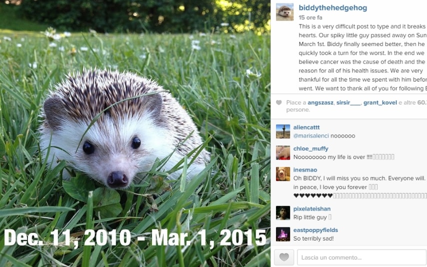 Non era tanto lo sfondo, quanto la posa e quel musetto a conquistare il pubblico di Instagram. Oltre 600mila persone seguivano Biddy, piccolo riccio in giro per il mondo, divenuto una vera e propria star sul social network. Oggi, però, sul profilo è stato pubblicata una foto, con una notizia che nessuno avrebbe mai voluto leggere: Buddy è morto. A darne la triste notizia sono stati Toni DeWeese e Tom Unterseher , i due giramondo, la cui intenzione era quella di permettere, a chi capitasse sul loro profilo Instagram, di vivere tante avventure assieme al loro piccolo compagno tra montagne, foreste, cascate e fiumi, dalla California all’Oregon. “Questo è un post molto difficile da scrivere – scrivono i proprietari del riccetto - che rompe i nostri cuori. Il nostro piccolo amico appuntito è scomparso domenica 1° marzo. Biddy sembrava migliorati, ma poi all'improvviso le sue condizioni sono peggiorate. Crediamo che sia stato il cancro a portarselo via. Siamo grati per tutto il tempo che abbiamo trascorso con lui prima che ci lasciasse. Vogliamo ringraziare tutti voi per aver seguire Biddy e le sue avventure. E' stato davvero sorprendente vedere persone provenienti da tutte le parti del mondo, condividere e commentare le sue foto. Non avremmo potuto chiedere un riccio migliore. Biddy era una grande parte della nostra famiglia e ora ci mancherà molto".