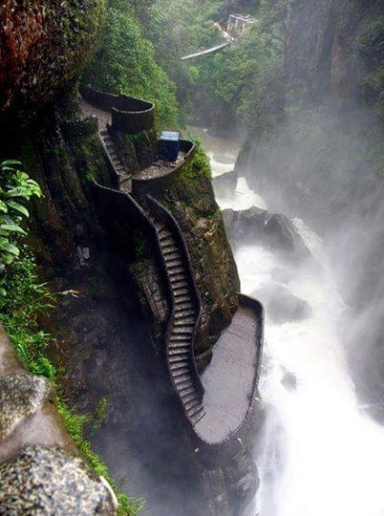 Uno dei posti più spettacolari al mondo: siamo in Ecuador e questa lunga scalinata fa da contorno alla "Pailon del Diablo" (Calderone del Diavolo", spettacolare cascata che si trova sul fiume Pastaza. Dall'alto la veduta è davvero spettacolare e allo stesso tempo mette temibile soprattutto dal ponte sospeso dove i turisti possono provare l'ebbrezza del brivido.
