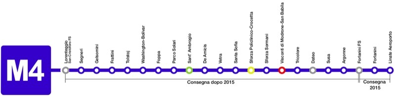 Fermate Linea M4: San Cristoforo, Segneri, Gelsomini, Frattini, Tolstoj, Washington Bolivar, Foppa, Parco Solari, S. Ambrogio, De Amicis, Vetra, Santa Sofia, Sforza Policlinico, San Babila, Tricolore, Dateo, Susa, Argonne, Forlanini FS, Q.re Forlanini, Linate