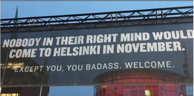 All'ingresso dell'aeroporto di Helsinki è stato posizionato un enorme manifesto di benvenuto che dice: "Nessuno sano di mente verrebbe mai a Helsinki a novembre. Tranne te. Sei un grande. Benvenuto". Un modo ironico e simpatico di ringraziare i turisti coraggiosi che sfidano il freddo finlandese per visitare la città. Il cartello è stato ideato in occasione di Slush, una conferenza sulla tecnologia.