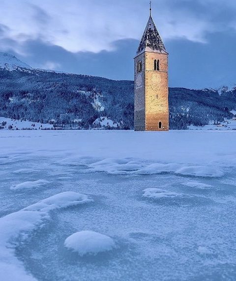 Il lago di Resia  è un lago alpino artificiale situato a 1.498 m s.l.m. nel comune di Curon Venosta in Alto Adige. Lo spettacolo che regala ogni qualvolta le temperature si abbassano di molto sotto le zero, è davvero magnifico. A rendere unico lo scenario, il famoso campanile di Curon che si erge sopra lo strato di acqua ghiacciata e neve.
