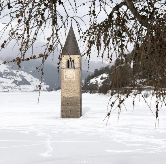 Il lago di Resia  è un lago alpino artificiale situato a 1.498 m s.l.m. nel comune di Curon Venosta in Alto Adige. Lo spettacolo che regala ogni qualvolta le temperature si abbassano di molto sotto le zero, è davvero magnifico. A rendere unico lo scenario, il famoso campanile di Curon che si erge sopra lo strato di acqua ghiacciata e neve.