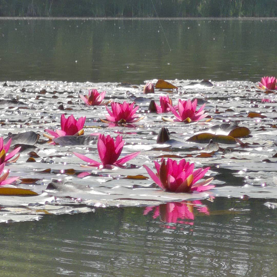 Questo lo spettacolo naturale immortalato sul lago Azzurro del Parco della Brughiera Briantea. Una distesa di ninfee rosa colorano le acque del lago e vi si rispecchiano.