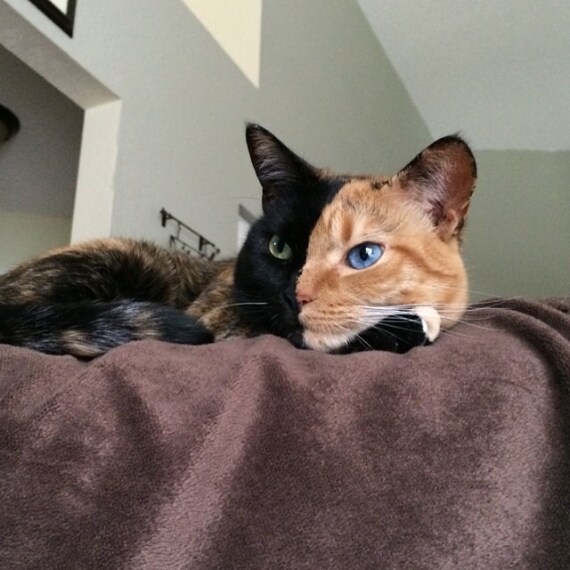 Si chiama Venus, è stata trovata in Nord Carolina e adesso vive le sue giornate cercando luoghi confortevoli in cui riposare. La sua caratteristica? E' evidente: corpo maculato su tonalità rosse e nere che si dividono nettamente sul viso, illuminato inoltre da due occhi di colore diverso. Bellissima! https://www.facebook.com/VenusTheAmazingChimeraCat