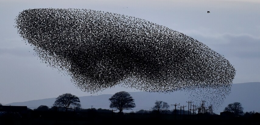 Scozia. Che accada per divertimento o per necessità, che sia una forma di comunicazione o altro le massicce formazioni sullo sfondo di Criffel Mountain disegnano un meraviglioso scenario naturalistico. Tuttavia, la motivazione del massiccio spostamento di migliaia di uccelli rimane quella della protezione da possibili predatori.