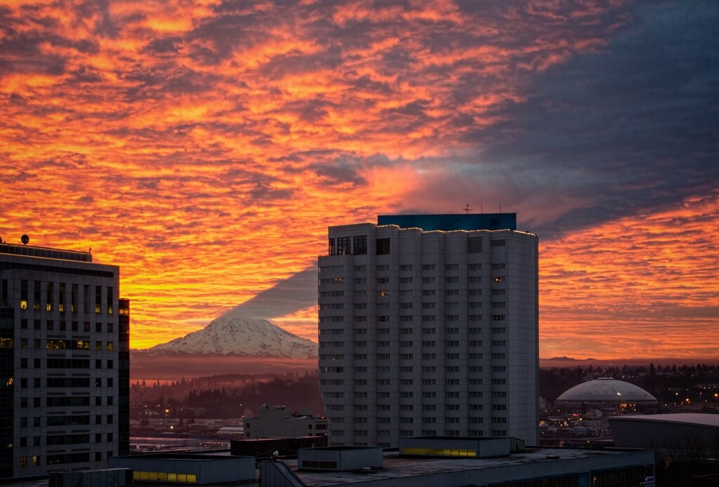 Monte Rainier, lo spettacolo dei raggi crepuscolari all'alba