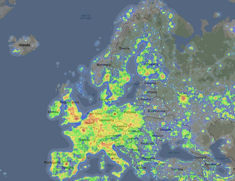 La mappa del'inquinamento luminoso di tutto il mondo: al primo posto Europa e meta USA