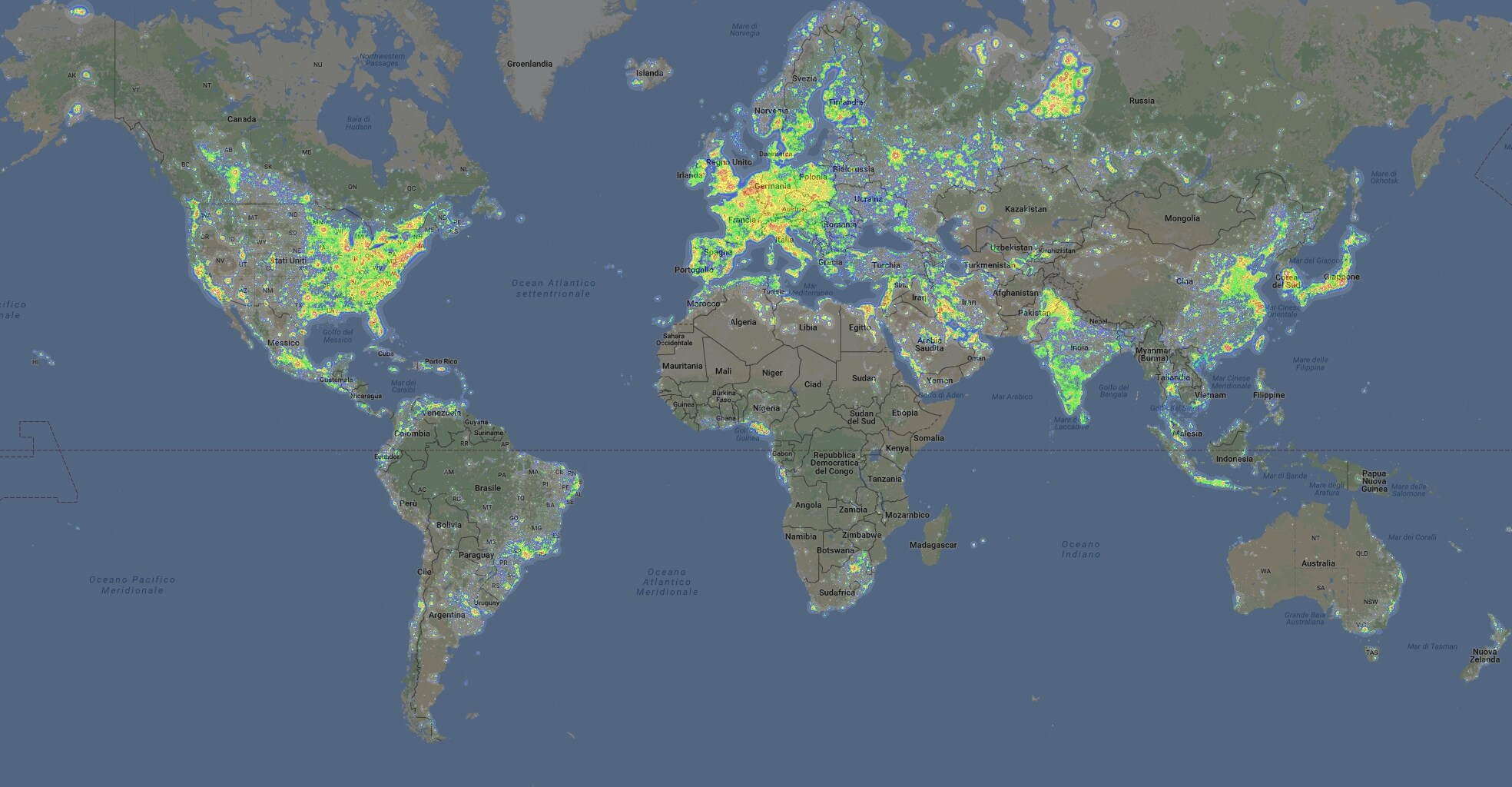La mappa del'inquinamento luminoso di tutto il mondo: al primo posto Europa e meta USA