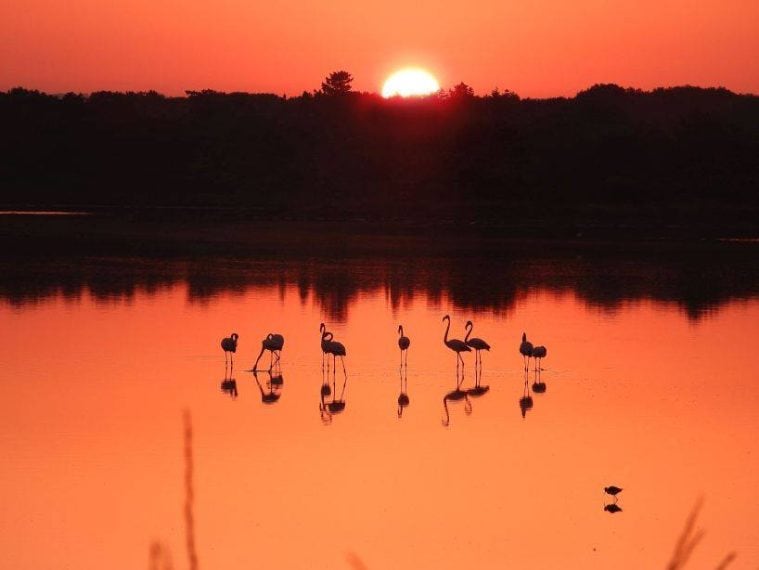 Taranto, lo spettacolo dei fenicotteri rosa al tramonto sulla Salina dei Monaci di Torre Colimena