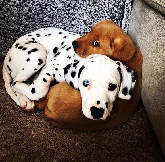 Questi due cagnolini non potranno non scioglierti il cuore. Pur non essendo figli della stessa madre questi due cucciolo non possono far altro che coccolarsi a vicenda, impossibile resistergli.