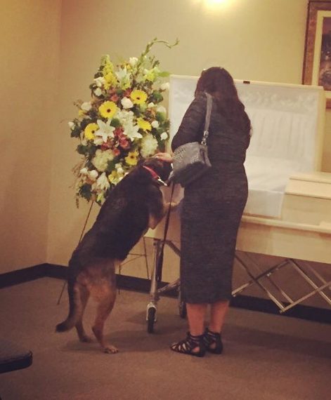 Sadie è un meticcio di 13 anni, che da cucciolo fu adottato da un uomo che l'ha accudito come un figlio e tenuto in famiglia. Quando tragicamente, a causa di un infarto, l'uomo è morto (come raccontato dalla pagina Facebook "Elements Cremation, Pre-planning & Burial"), il cane il giorno del funerale sembrava inconsolabile e insieme alla moglie dell'uomo si è avvicinato alla bara per l'ultimo saluto