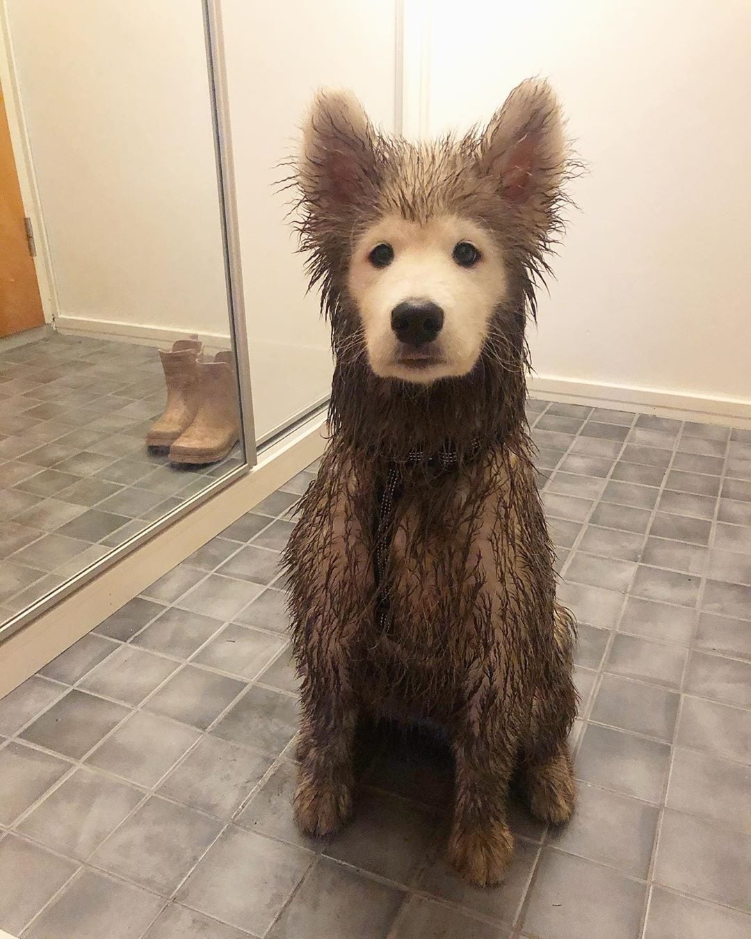 Onni, un Samoiedo di cinque mesi di Helsinki, in Finlandia, ha trasformato il suo pelo bianco e vaporoso dopo una passeggiata nel fango. Prima di intraprendere la passeggiata, Onni assomigliava a una nuvola bianca soffice, dopo essersi immerso nella sporcizia era tutto coperto di fango tranne il muso rimasto pulito.
