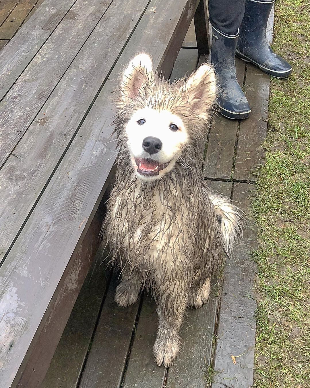 Onni, un Samoiedo di cinque mesi di Helsinki, in Finlandia, ha trasformato il suo pelo bianco e vaporoso dopo una passeggiata nel fango. Prima di intraprendere la passeggiata, Onni assomigliava a una nuvola bianca soffice, dopo essersi immerso nella sporcizia era tutto coperto di fango tranne il muso rimasto pulito.