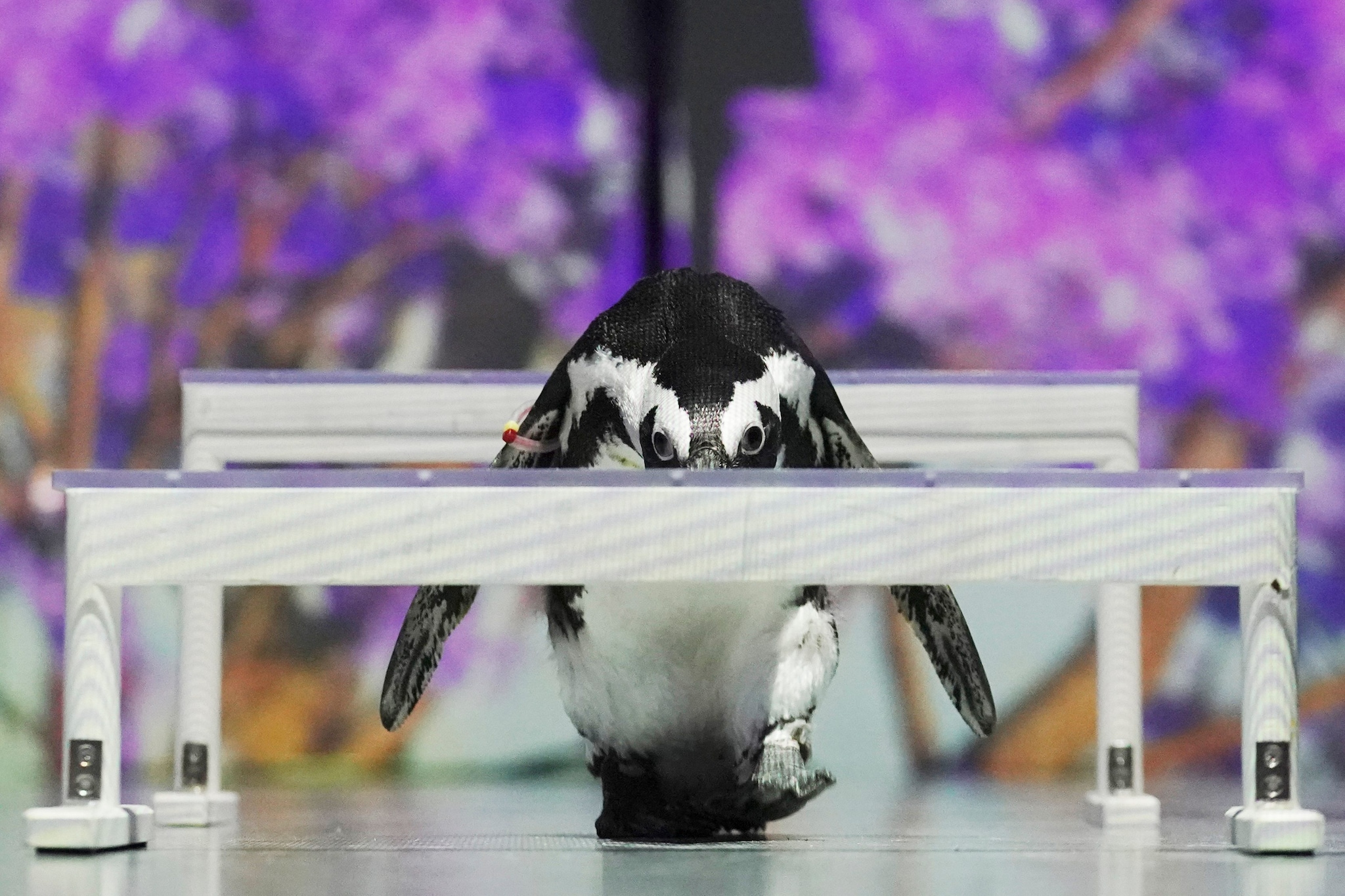 Momo e Omochi si esibiscono per un programma video sul sito web dell'Aqua Park Shinagawa durante un'anteprima multimediale a Tokyo giovedì 30 aprile 2020. Per la sicurezza dei clienti, l'acquario è stato temporaneamente chiuso dal 31 marzo per prevenire la diffusione di nuove infezioni da coronavirus.