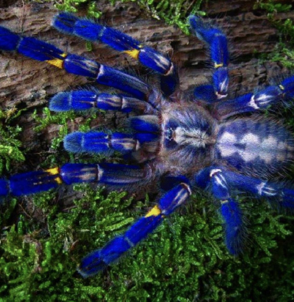 Si tratta di una tarantola blu, conosciuta con il nome scientifico di Poecilotheria metallica. Questo ragno molto bello, abita le regioni meridionali dell'India, non supera i 5/6 centimetri di lunghezza e non è solitamente aggressivo. Il suo veleno non è letale per l'uomo.