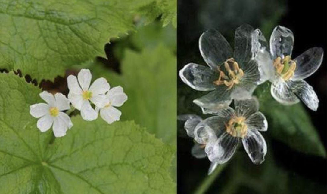 Questa, che apparentemente sembra una comune pianta ornamentale, in realtà nasconde una bella particolarità. Presente in alcune zone del Giappone e della Cina, il suo nome è Diphylleia grayi, ma è maggiormente nota col nome inglese Skeleton Flower. La sua particolarità sta nel fatto che i suoi piccoli fiorellini bianchi divengono trasparenti a contatto con l'acqua, regalando un vero e proprio spettacolo a chi si ferma ad ammirarli. Quando entra in contatto con l'acqua piovana, la pigmentazione della corolla sparisce, lasciando il fiore trasparente.