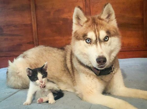 Una husky trova una scatola piena di gattini abbandonati e li adotta diventando la loro mamma